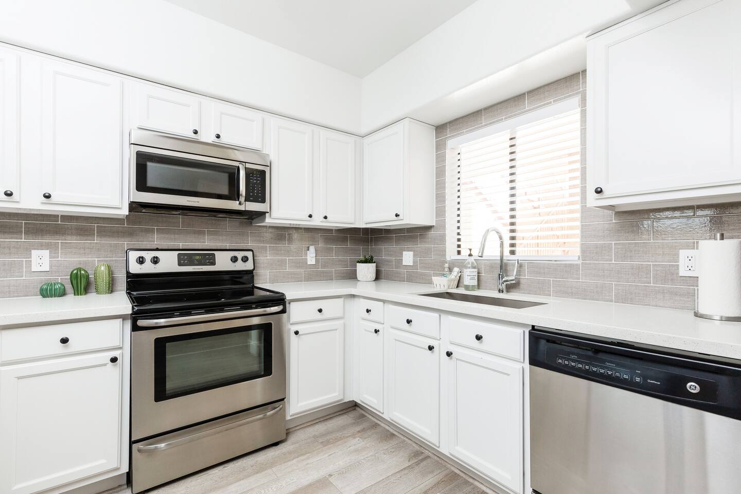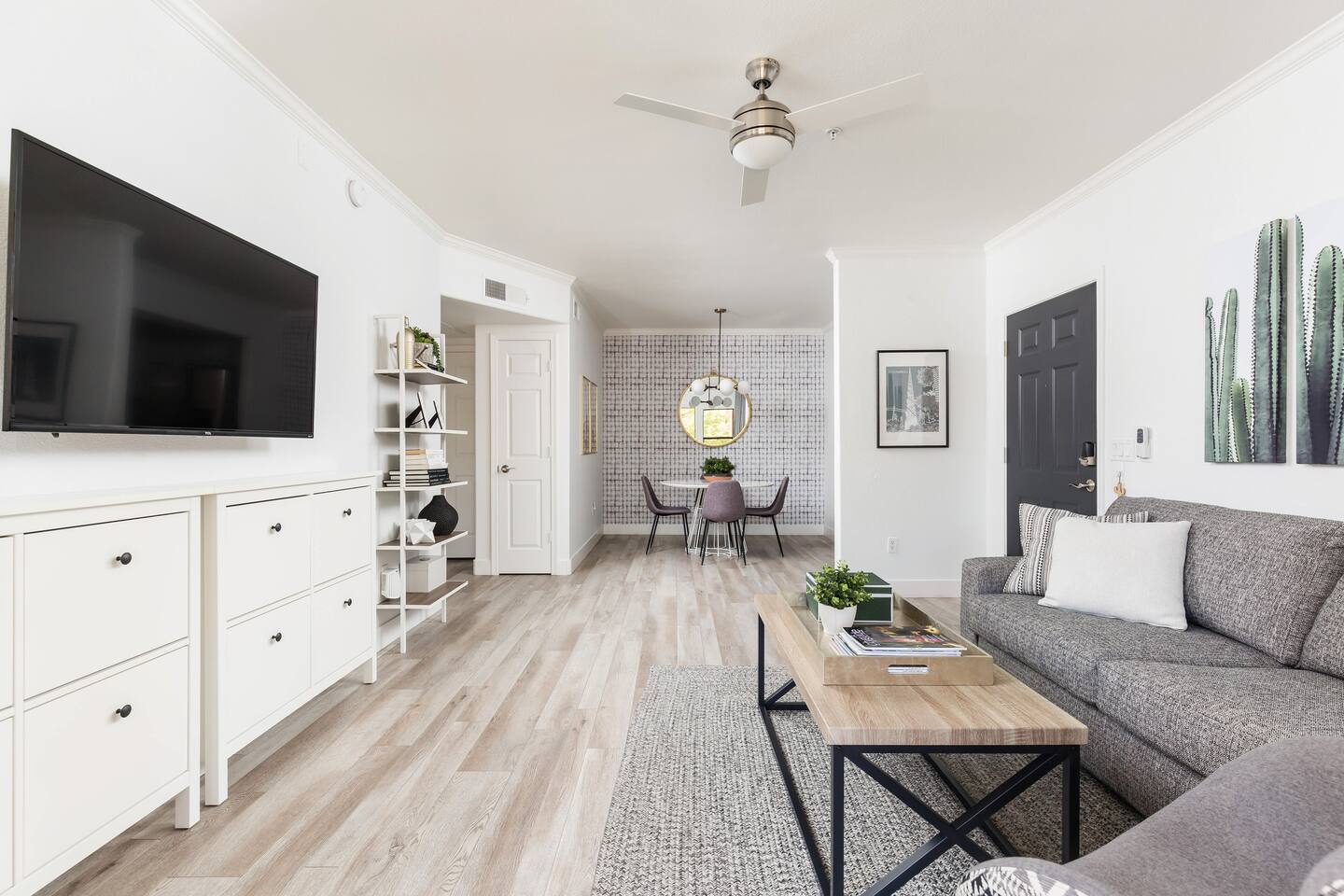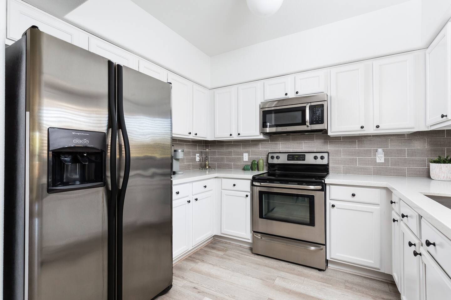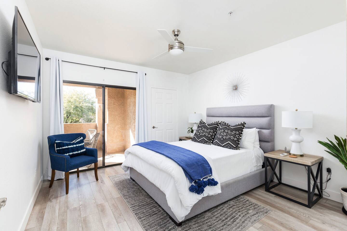 This luxury condo is equipped with a fully stocked kitchen with everything you'll need. Coffee maker, Keurig, blender, ice maker in refrigerator, etc. Full-size Washer and Dryer is located in the unit. Large refrigerator for all of your food/drink stocking and cooking needs. The living room boasts brand new furniture with Flat Screen LED TV with expanded cable channels, Netflix access, and DVD player. Beautiful Dining area with custom wallpaper and flexible seating. A great place for dinners at home or to play one of the many games available in the unit. Master Bedroom includes a Flat Screen LED TV and a Tuft & Needle memory foam mattress with additional mattress topper for perfect firmness, and access to the patio. Fully remodeled Bathroom has an oversized tab and shower with new plumbing, new fixtures, and quartz counter tops. Dedicated covered parking spot included right in front of the unit. [TPT License # 21404242]