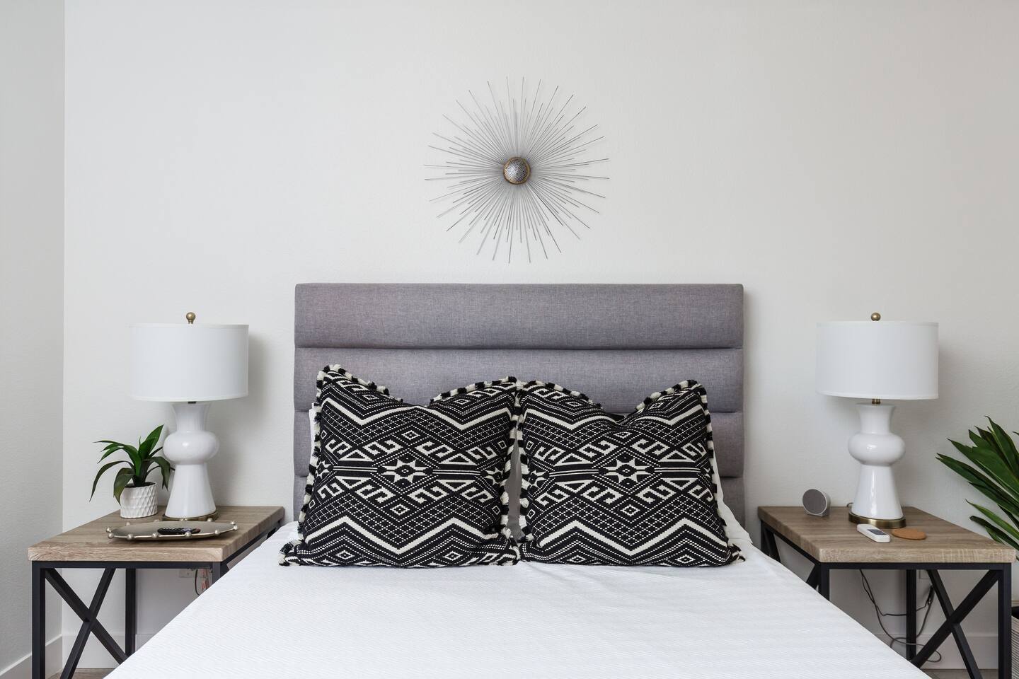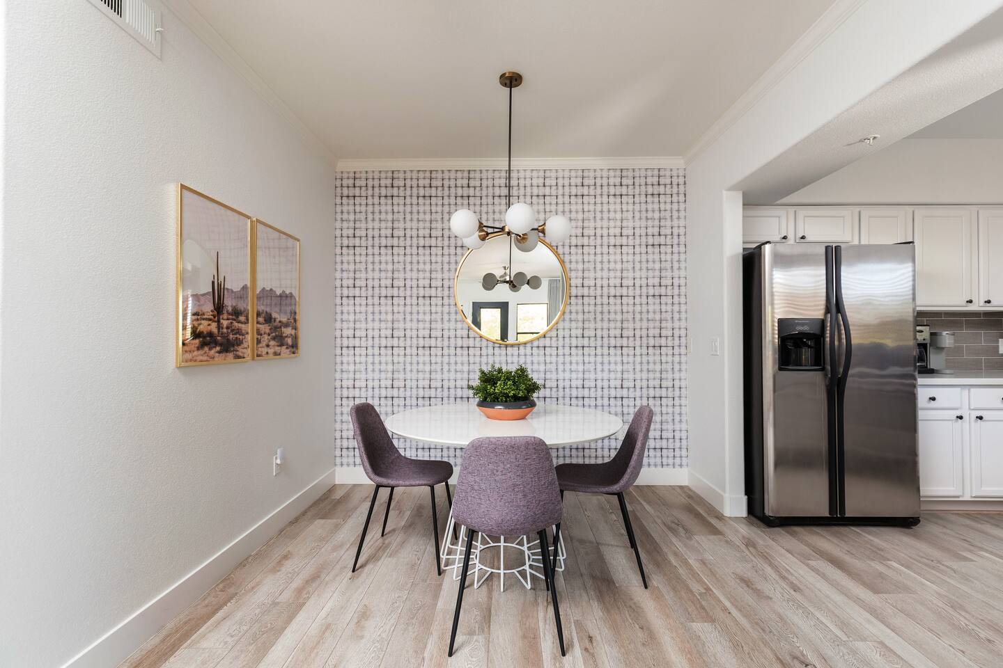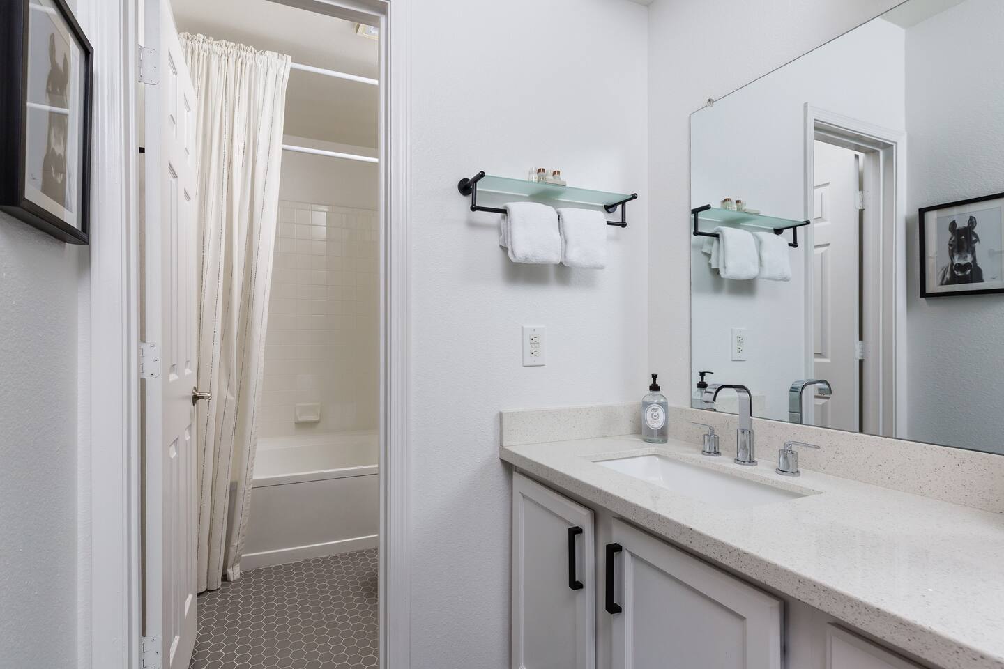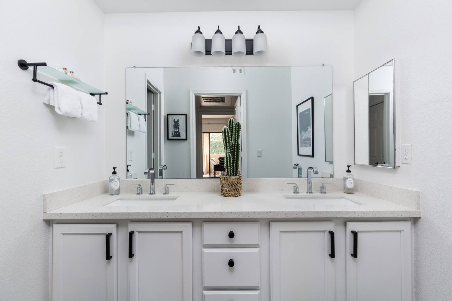 This luxury condo is equipped with a fully stocked kitchen with everything you'll need. Coffee maker, Keurig, blender, ice maker in refrigerator, etc. Full-size Washer and Dryer is located in the unit. Large refrigerator for all of your food/drink stocking and cooking needs. The living room boasts brand new furniture with Flat Screen LED TV with expanded cable channels, Netflix access, and DVD player. Beautiful Dining area with custom wallpaper and flexible seating. A great place for dinners at home or to play one of the many games available in the unit. Master Bedroom includes a Flat Screen LED TV and a Tuft & Needle memory foam mattress with additional mattress topper for perfect firmness, and access to the patio. Fully remodeled Bathroom has an oversized tab and shower with new plumbing, new fixtures, and quartz counter tops. Dedicated covered parking spot included right in front of the unit. [TPT License # 21404242]